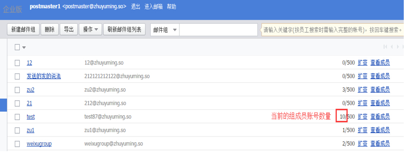 1. 单击邮件组列表的 查看成员 按钮,进入组成员编辑界面。